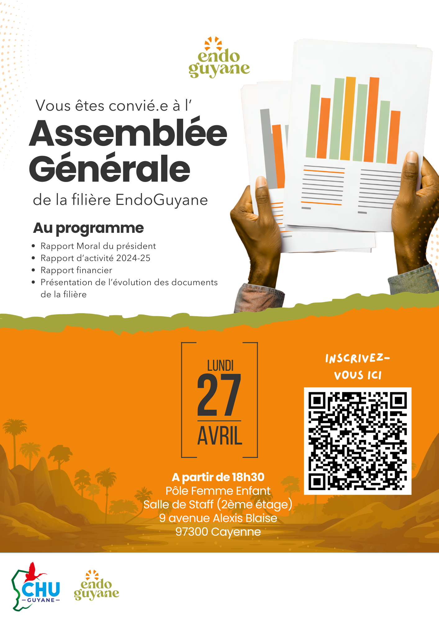 La filière EndoGuyane a le plaisir de convier ses membres, partenaires, professionnels de santé et personnes intéressées par ses actions à son Assemblée Générale, qui se tiendra le lundi 27 avril 2026 à partir de 18h30 au CHU site de Cayenne